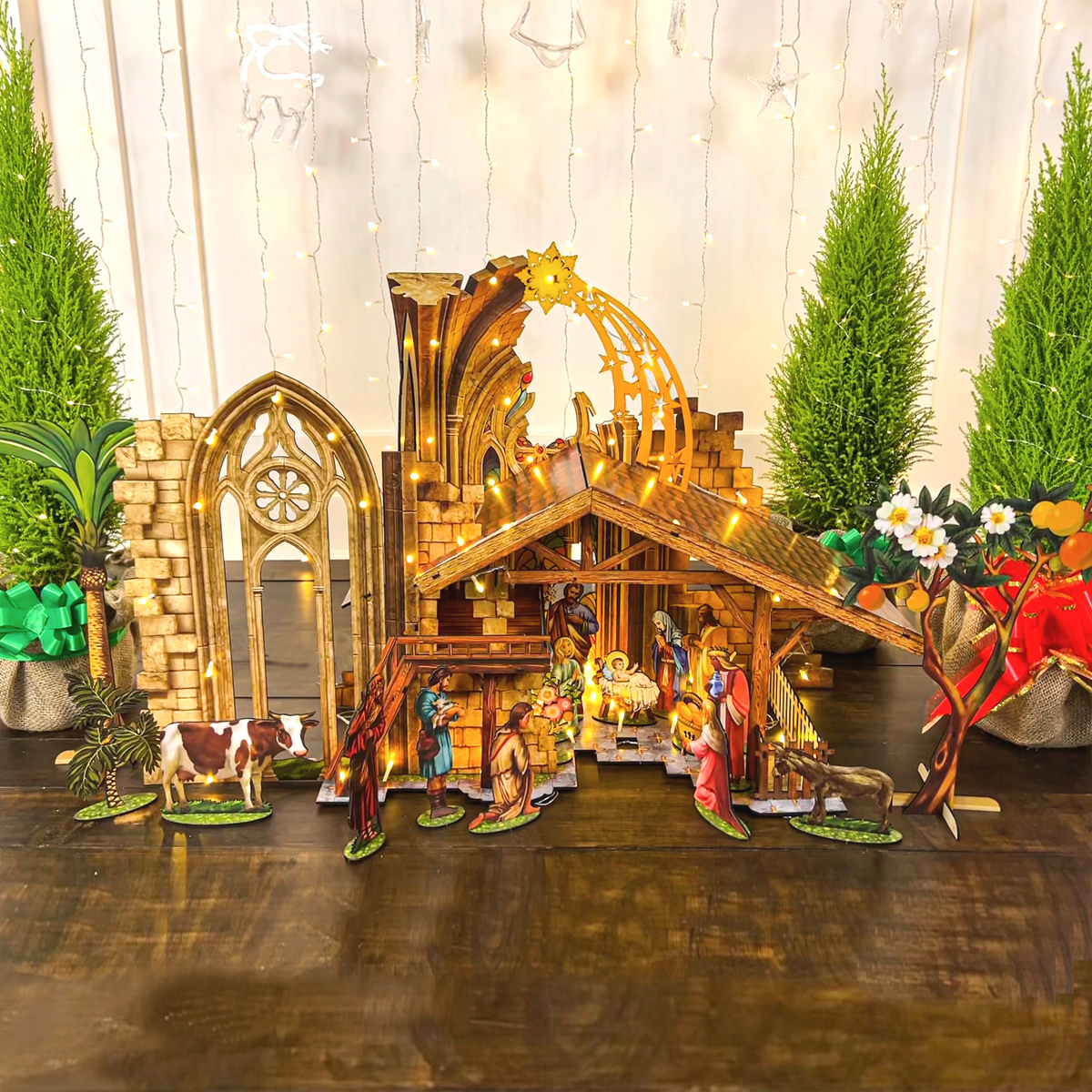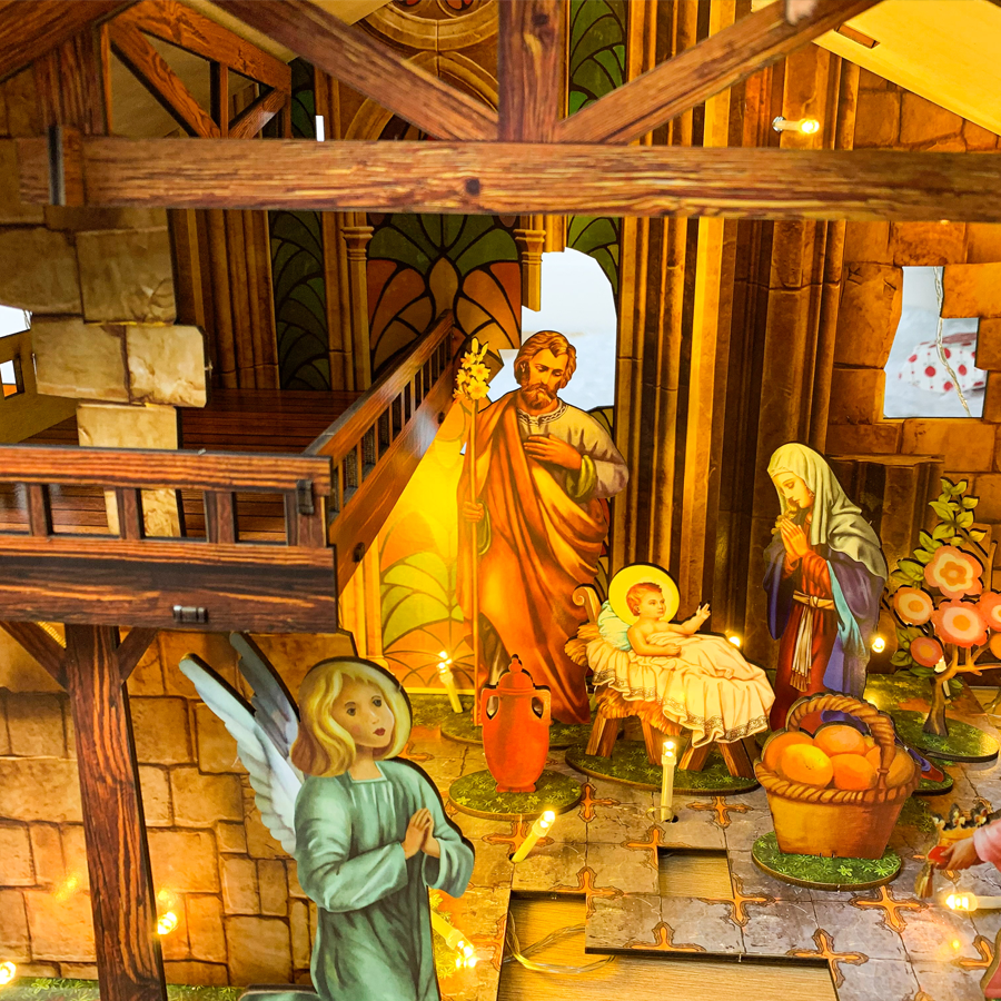 Các chi tiết của Hang Đá Giáng Sinh kích cỡ 0,8m được thể hiện sinh động hơn so với mô hình giấy. Mô hình được lắp ráp từ bộ kit gỗ in màu nên các nhân vật, cây cối cho đến con vật đều rất chân thực. Chính màu sắc tươi tắn cũng giúp cho mô hình thể hiện được một cách hoàn hảo vẻ đẹp của khoảnh khắc thiêng liêng khi Chúa vừa sinh ra đời.