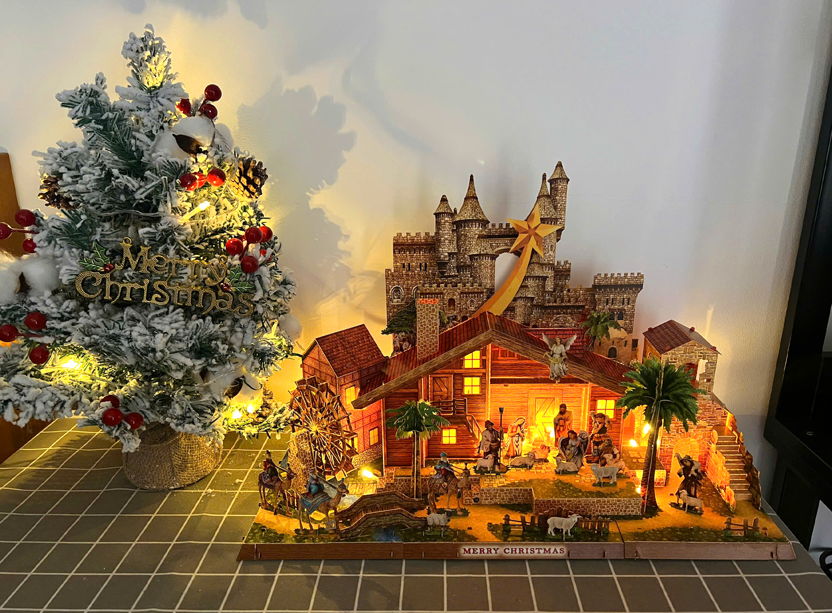 Sản phẩm bằng gỗ, cầm nặng tay, có hướng dẫn lắp. Shop nói có thể tháo ra và tái sử dụng cho năm sau nữa, rất tiện! Tone màu tuyết trắng đúng gu tôi